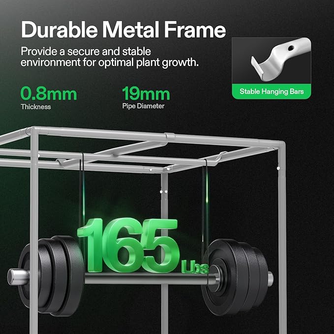 - Sturdy Frame & Strong Zipper: The thickened 19mm poles and durable metal frame enhance the overall load-bearing capacity, up to 165 lbs.; The strong zippers and tightly reinforced seals prevent light seepage and maximize the reflectivity of usable light