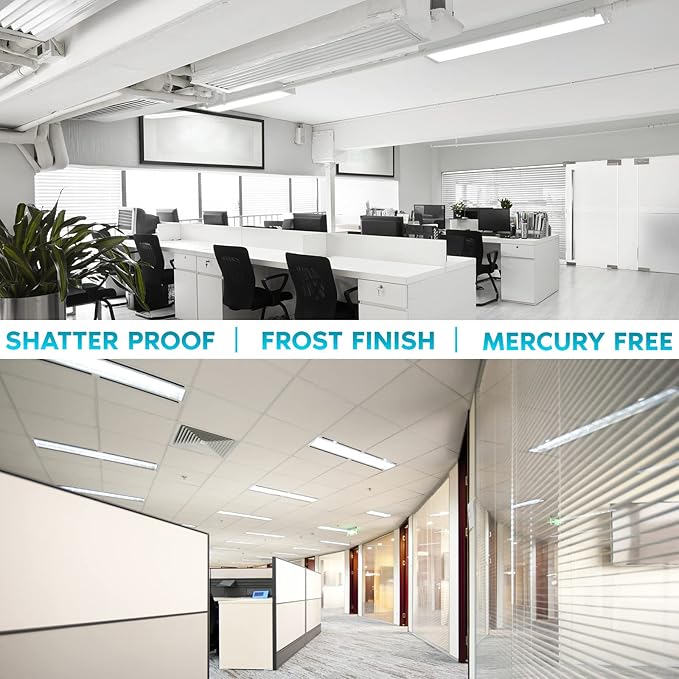 - High Brightness & Efficiency β Each 4-foot LED tube delivers 3000 lumens of 4000K cool white light at 24β54W, achieving an efficiency of 125 lm/W. Ideal for use in garages, workshops, offices, basements, and utility rooms as a direct replacement for 48-inch fluorescent tubes.