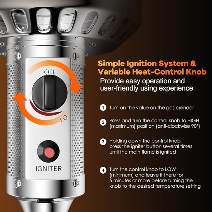 - Quick Start & Adjustable Heat: The user-friendly start-up ignition system keeps you away from troubles. Just simply press the button to light up this standing gas heater. The rotatable heat control knob allows you to set your desired heat setting and turn the patio heater completely off after using.