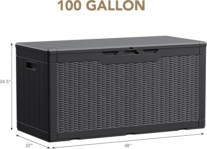 - Large Storage Space: This deck box has a storage capacity of 100 Gallon with inner dimensions: 47.8"L x 21.4"W x 24.6"H. It will provide enough room to store all your belongings for indoors and outdoors, such as pillows, tools and equipments