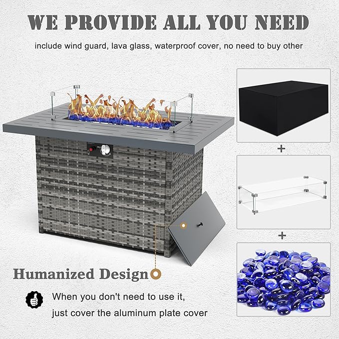 Propane Fire Pit Table,44 Inch 55000 BTU Outdoor Gas Fire Pit Rectangular with Glass Wind Guard for Outside Patio Deck (Gray-Aluminum Top)