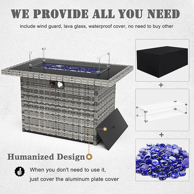 Propane Fire Pit Table,44 Inch 55000 BTU Outdoor Gas Fire Pit Rectangular with Glass Wind Guard for Outside Patio Deck (Gray-Glass Top)