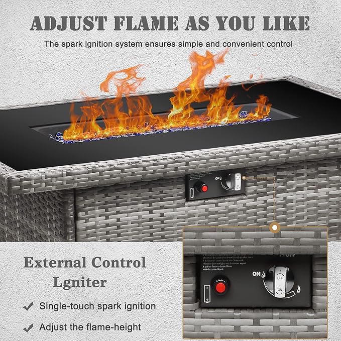 - SAFETY ECO-FRIENDLY - The 55000 BTU outdoor firepit table with CSA certification.Upgraded dual-tube burner to provide more stable and cleaner combustion.The button automatic ignition design can adjust and control the flame level, which is safer and more convenient.