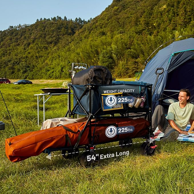 - EXTRA LONG WAGON: Featuring an extended lower shelf measuring 54 inches; perfect for transporting oversized items such as chairs, tents, canopy and more