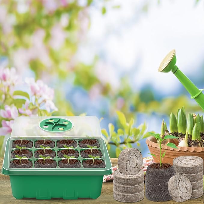 - 【Value Package】The kit contain 4 pcs green base trays, 4 pcs seed trays with 12 cells in each, 4 pcs humidity lids with dome, and 50 pcs peat pellets, not need soil to fill the cells, help you keep clean and tidy when planting, and creates a moist and warm environment needed for seed germination.