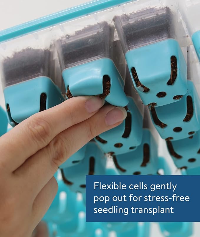- SIMPLER TRANSPLANTING: Soft food-grade silicone cells cradle seedlings and gently flex to pop out when it’s time to transplant into your outdoor garden! This system is specially designed to reduce stress on your seedlings, so you don't damage their roots. After transplanting, trays are easy to clean and reuse or simply store for next growing season. Top shelf dishwasher safe.