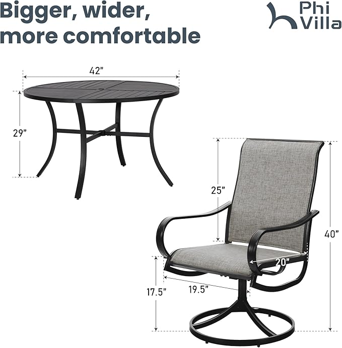 - Chairs & Table Dimension: Chairs: 19.5"W x 20"D x 40"H, Table: 42"Dia x 28"H (1.57"-1.9" Umbrella Hole )๏ผEach package coming with clear instructions and all necessary accessories