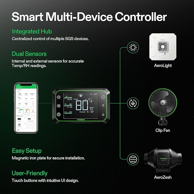 - The GrowHub: The central hub for the Vivosun Smart Grow System, controls all tent equipment simultaneously, allows you to adjust operation of equipment with simple to read interface, Grow Recipes take plants from seed to harvest automatically, can control many devices and is compatible across platforms, easy to install on tent walls with magnetic mounting plate