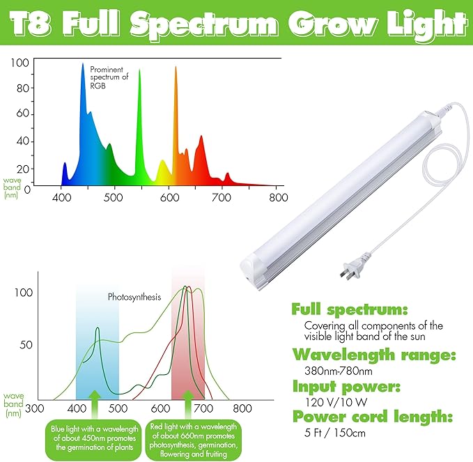 - T8 Full Spectrum Grow Light: the full spectrum plant light simulates sunlight, which can supplement the light needed for plant growth a day, helping plants perform photosynthesis for a long time, quickly accumulate organic matter and grow rapidly
