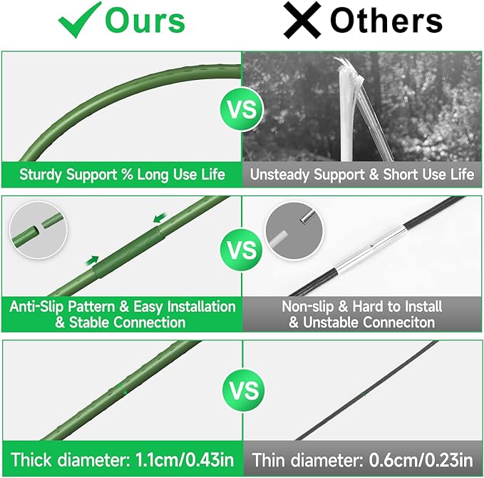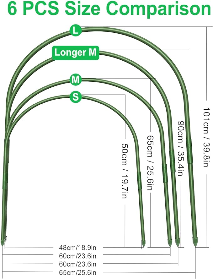 - ►Premium Material and Flexible combination-- High-quality plastic coated steel pipe, not easy to rust, can be used for a long time. we provide 6Pcs greenhouse hoops and 12Pcs green fixed supports, 1Pc greenhouse hoop combined with 2Pcs green fixed supports can extend the height of the greenhouse hoop.