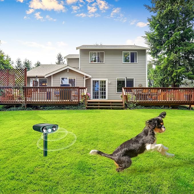 - Ultrasonic Technology: this ultrasonic animal repellent features the advanced ultrasonic technology, the PIR motion detection sensor starts to work, then it emits ultrasonic waves and turns on the red light to scare away the animals