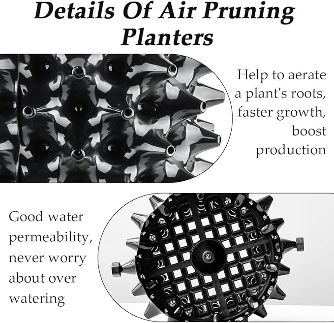 - 3 gallon Pots for Plants: Top Diameter : 10", Base Diameter: 10“, Height: 10". Air pruning container is very good for transplant, when plants grow bigger. Because when you unscrew the plugs and take out the plant, the soil and roots is 99% together, so the plants transplant survive rate is almost 100%.
