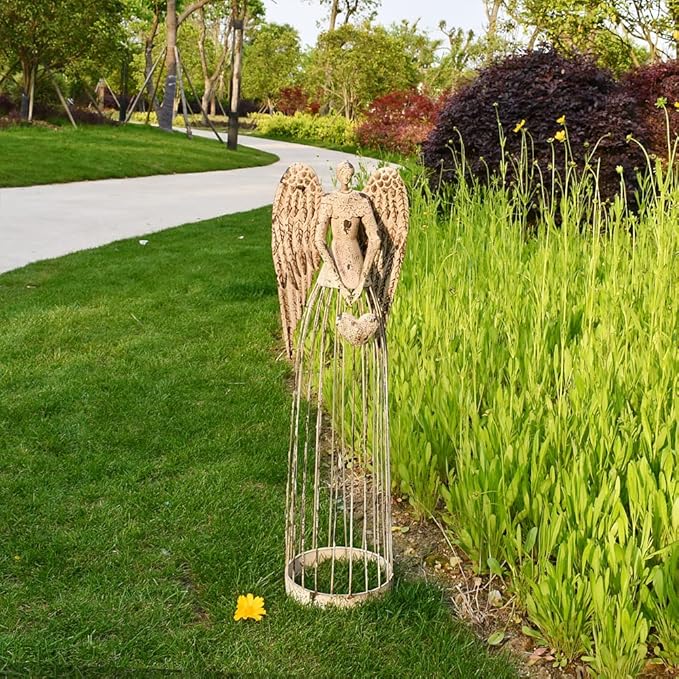 - DIVINE HOME DECOR: The metal angel sculpture is a great holy decor for spring, summer, fall and winter. Itβs suggested to use some trellis anchors to hold the metal angel for yard during stormy or windy days.