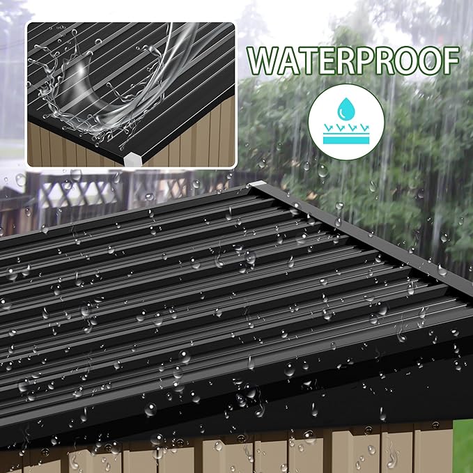 - Outdoor Shed: The material of the metal shed has strong rust and UV protection, whether it's heavy rain, hot sun, or snow, you don't have to worry about your outdoor shed. And the storage shed is designed with a lockable door, which improves the safety of outdoor use and prevents some small animals from accidentally entering.
