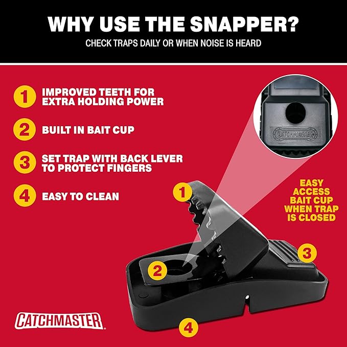 - HEAVY-DUTY: QUICK Kill: Jumbo Snapper Traps are made from heavy-duty industrial-grade plastic with a powerful mouth and gripping teeth that close with great force and instantly kill the rat. The Snapper rodent trap was designed with specific trigger sensitivity for a fast and effective snap.