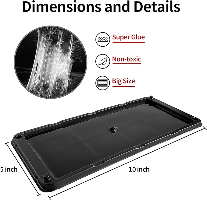 - Wide Application: These large and heavy-duty 5" x 10" trays come out as pairs, traps can be placed in areas where the mice are most likely to run, along walls, or skirting boards where pests are active. Ideal for the basement, residences, warehouses, restaurants, houses, indoor, industrial buildings, and attic use. Actually effective in catching everything from snakes, mice, rats, lizards, crickets, scorpions, spiders and etc.
