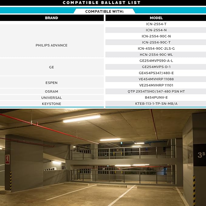 - High Brightness & Efficiency β Each 4-foot LED tube delivers 3000 lumens of 4000K cool white light at 24β54W, achieving an efficiency of 125 lm/W. Ideal for use in garages, workshops, offices, basements, and utility rooms as a direct replacement for 48-inch fluorescent tubes.