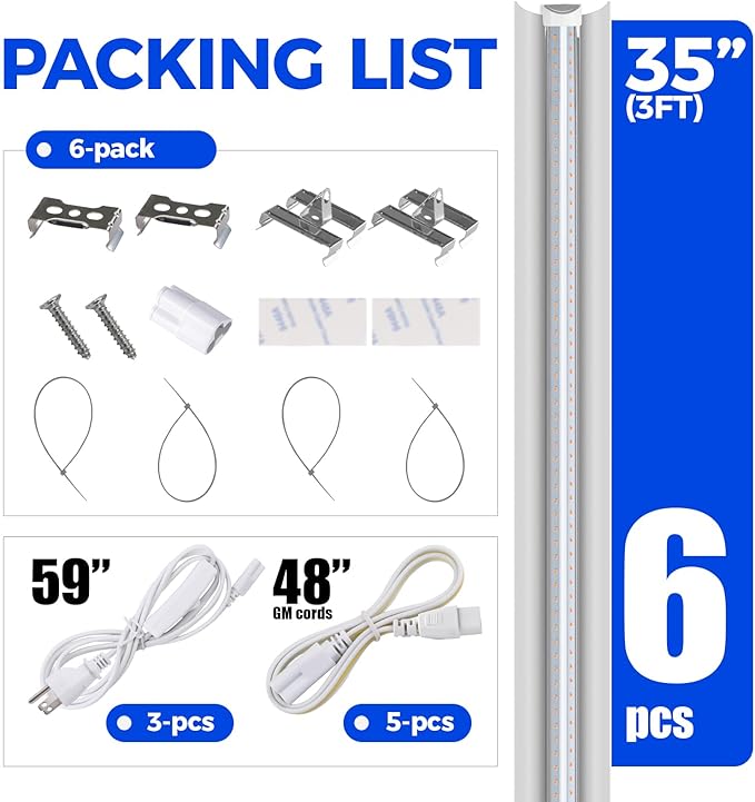 - What You Get: 6 x Barrina Grow lights 3ft, 3 x Power cords with ON/OFF switch, 5 x Connecting Cords(48''), 6 x Small Connectors, 24x Installation Clips, 12 x Tapes, 24 x cable ties