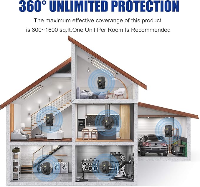 - EFFECTIVE COVERAGE AREA: The effective coverage is wide. The maximum effective range of ultrasonic mouse repellent is 800~1600 sq. ft in one single room. If there are multiple rooms in your house, it is recommended to install one per room to protect your home more effectively.