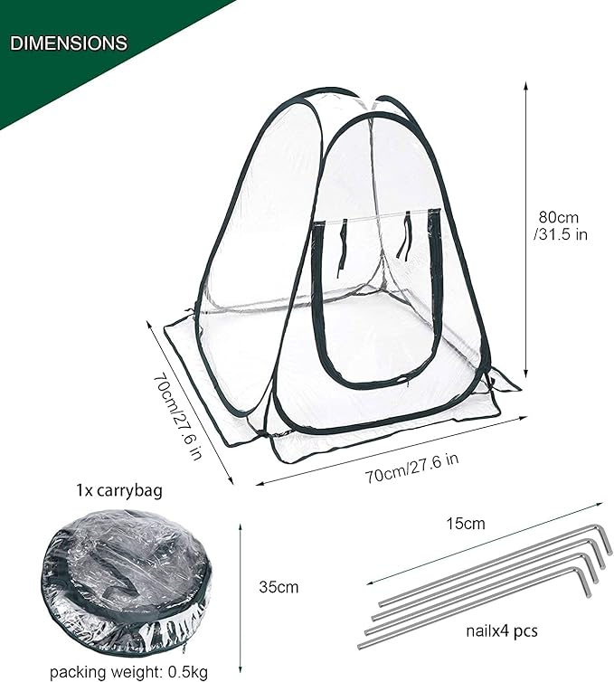 - Greenhouse Size: 27.6"x27."6x31.5" Package size:13.7"*13.7"*4" Package weight: 2.0KG Material: UV50+ PVC cover, steel hoops.