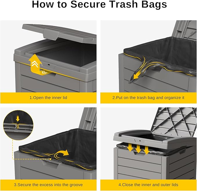 - ππ¨ππ πππ πππ¦πππ‘: The innovative double lid hides unsightly garbage bags, making the courtyard cleaner; the outer lid can be easily opened and closed with one hand by means of a clasp. After opening the inner lid, the garbage bag can be stably fixed in the card slot