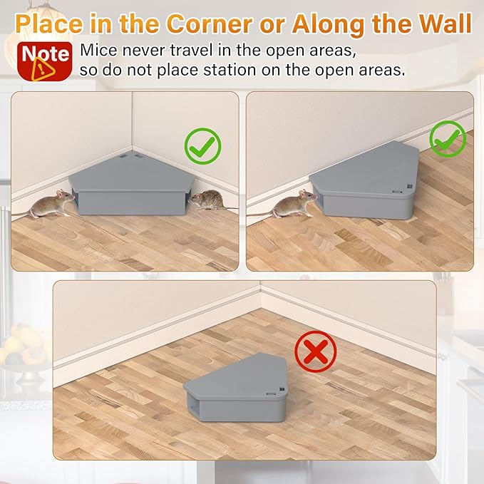 - 【Scientific & Effective Design】Our Mice station is designed with triangular shape and its low profile makes this station ideal for storing in tight spaces, corners, and under furniture. What's more, a tightly sealed lid keeps safe.