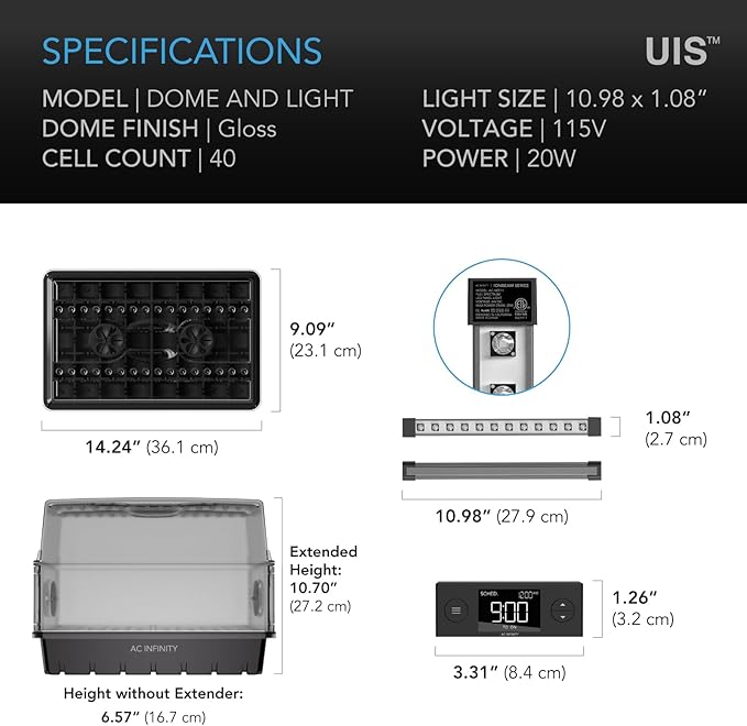 AC Infinity Heavy-Duty Humidity Dome with Full Spectrum LED Grow Light Bars, Samsung LM301H EVO Diodes, Drip Tray, 5x8 Cell Seedling Tray, 3mm Thick Dome and Vented Extension Panels, for Seed Starting