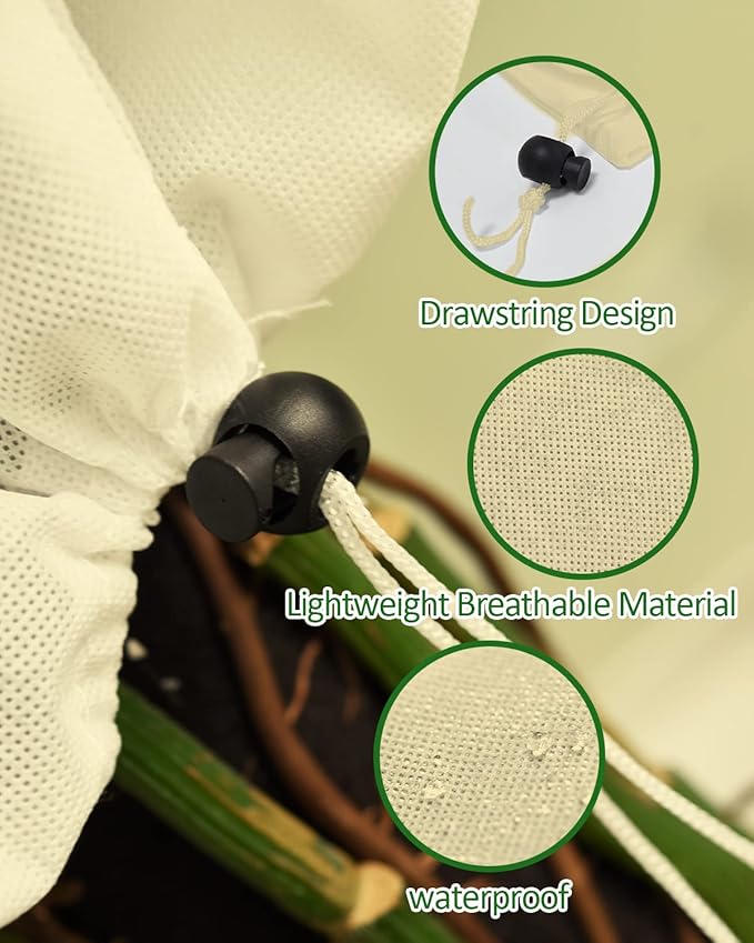 - SIMPLE DESIGN, CONVENIENT USE: The simple drawstring design makes it easy to put on and take off the plant frost blankets from outdoor plants, whether it's a quick cover before a heavy snowfall, or a meticulous inspection after the sun comes out, it is convenient to operate
