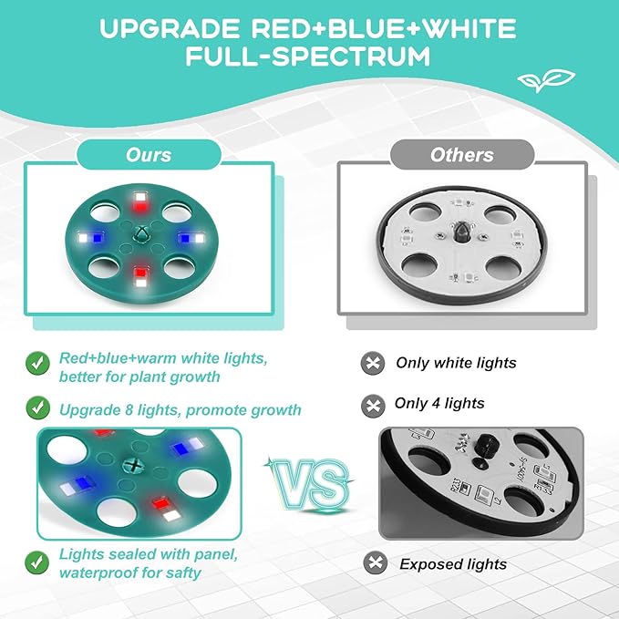 - π[Newest Upgrade Full-Spectrum Grow Lights]- This seed starter tray is upgraded with full-spectrum red+blue +warm white total of 8 grow light beads which is much more efficient for plant growth compared to regular only 4 white lights. The spectrum of our latest version of grow lights is similar to sunlight, which could simulate a natural growth environment for plants to promote photosynthesis, rooting, and germination. Meet your needs for different plants, especially in winter.