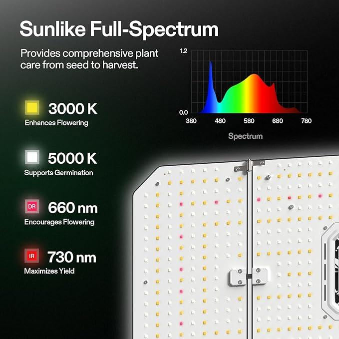 - Full-spectrum Sunlike Lighting: These LEDs deliver optimal light-spectrum coverage (380nm-780nm, 660nm, 3000K, 5000K) and produce maximum PAR output at various distances; The lights can get through the surface of plants and deep into them to increase yields