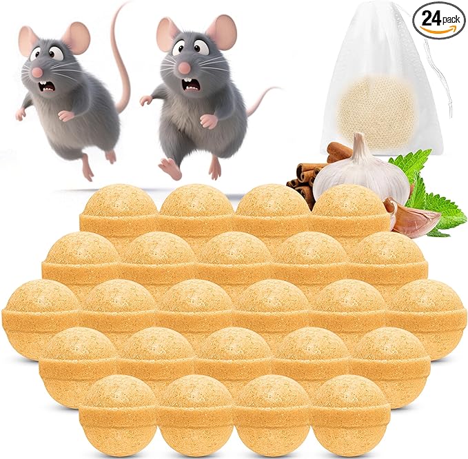 - 【LONG TIME TO PROTECTION】- Includes 24 packs repellent and 24 bags for hanging, one repellent ball can last around 2-3 months and protect 120 sq ft. Our mouse repellents also has a certain repellent effect on insects such as snake, cockroach, squirrel, centipedes, etc