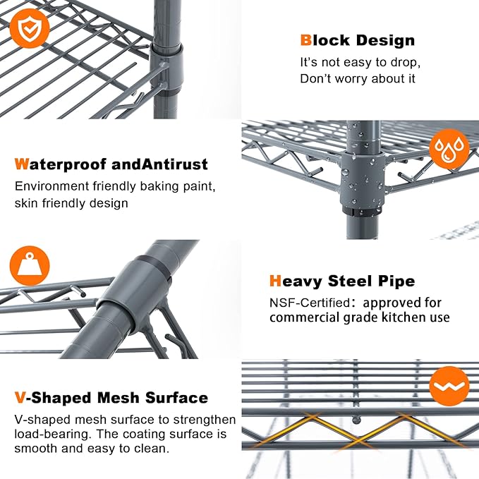 - 【EASY TO ASSEMBLY】: The storage rack is designed very simply, very easy to assemble, no assembly tools are required when assembling the metal shelf, even if you assemble it separately, the wire shelf unit can be handled quickly. With detailed instructions and no tools required, you can easily install it with others within 15 minutes.