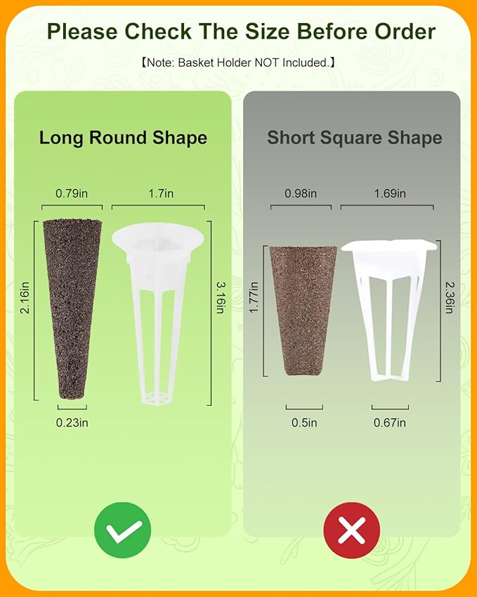 - Grow Sponges Fit Round Grow Basket: 80PCS Replacement AeroGarden seed pods are ROUND cone shape (NOT square) and measure about 0.9in across on the top and 2.7in long (approx.) after thoroughly soaking.