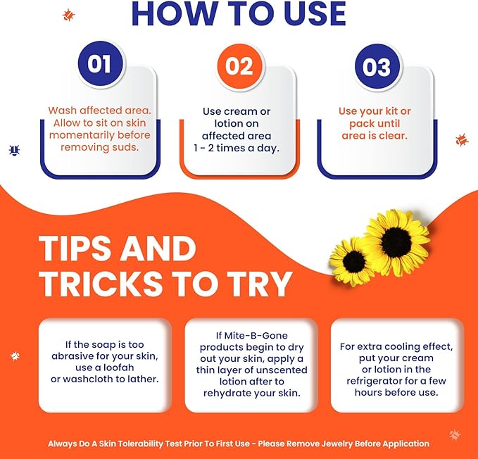 - TEST BEFORE THE REST: As with all new products, ALWAYS do a skin tolerability test before use. Drying of the skin may occur. Mite-B-Gone works for all skin types but may not be right for everyone's skin; If a reaction or irritation occurs, discontinue the use of the product.