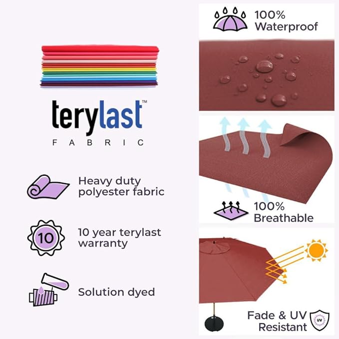 - Intelligent Design: Aluminum Pole: We donโt use rusting iron or steel! This pool umbrella has a thick 2.5mm wall that is rustproof and weather resistant that will provide peace of mind even under rainy weather. Both Terylast or Sunbrella fabrics are waterproof and solution dyed for optimal fade resistance under the beaming sun.