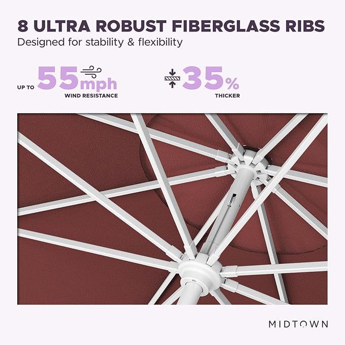 Midtown Umbrellas The Swilt 8 Feet Patio Umbrella in Terylast Cherry (Burgundy) Polyester Fabric - Fiberglass Ribs, Auto-Tilt Aluminum Frame For Backyard, Deck, Garden, Pool - White Pole