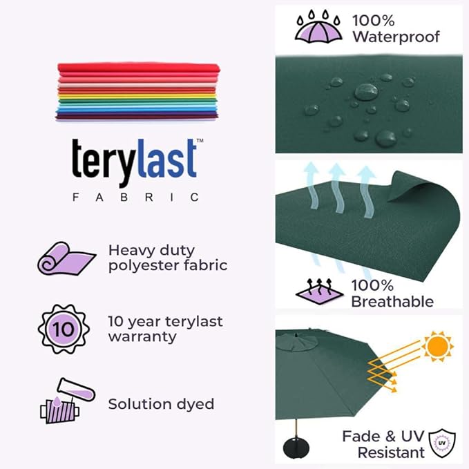 - Intelligent Design: Aluminum Pole: We donโt use rusting iron or steel! This pool umbrella has a thick 2.5mm wall that is rustproof and weather resistant that will provide peace of mind even under rainy weather. Both Terylast or Sunbrella fabrics are waterproof and solution dyed for optimal fade resistance under the beaming sun.