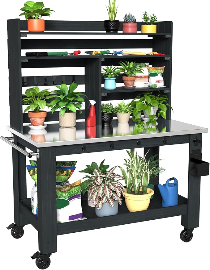 - Large Outdoor Potting Bench: one of the largest on the market gives you all the room you need to work and store your garden supplies. Overall size: 47.2"*25.95"*66.9"H. Stainless Steel Tabletop:45.25"*25.95". The big open shelf at the bottom and the shelves above the tabletop allow you to store a large number of plants,fertilizer. Or utensils,cups, beers,etc when for party use.