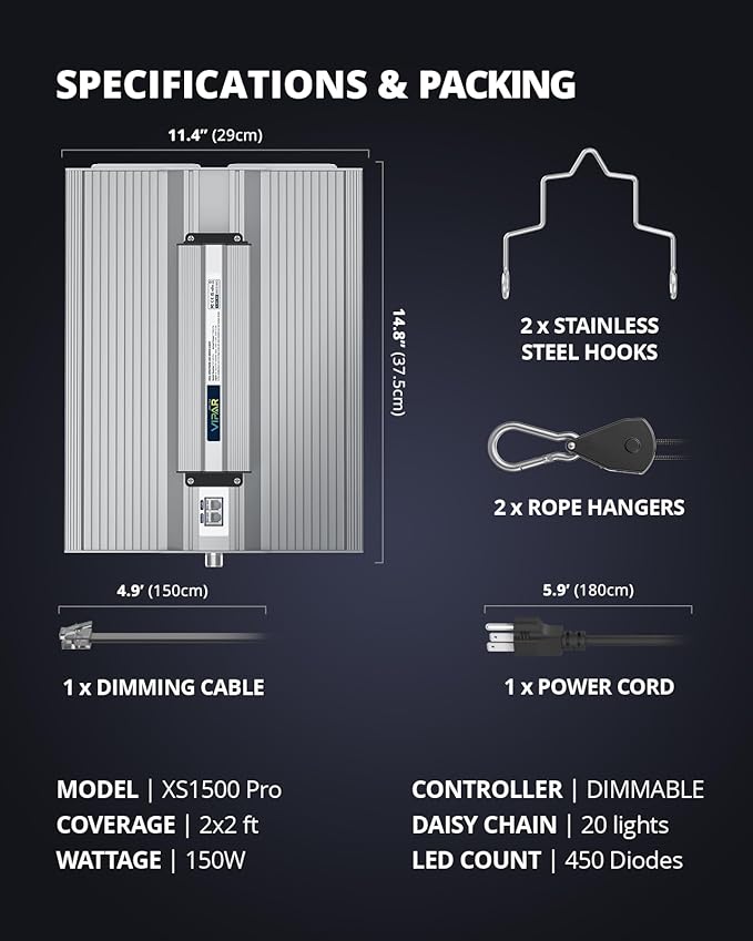 - Dimming Daisy Chain: This feature allows connecting up to 20 XS1500 Pro grow lights for unified dimming in commercial growing, horizontal & vertical farming, greenhouse planting, and hydroponics; a dimmer for accurate light level control as plants require