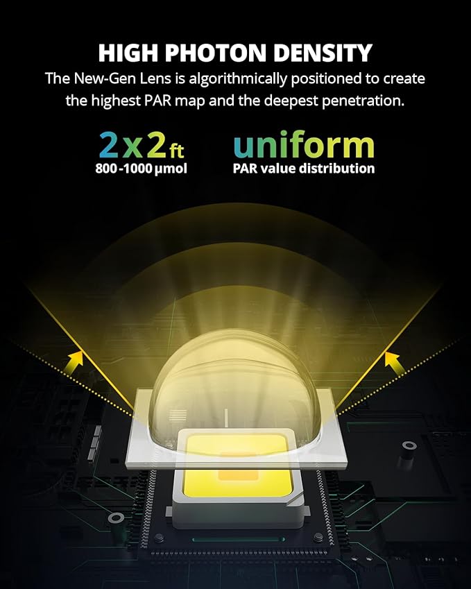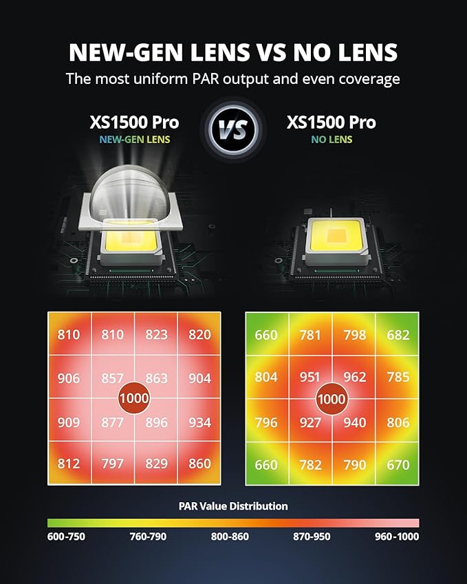 - Optical Lenses Design: Enables the XS1500 Pro LED grow lights for indoor plants to concentrate light with minimal loss, and achieve the most uniform PPFD at all corners for optimal photosynthesis, fostering balanced & healthier growth for higher yields