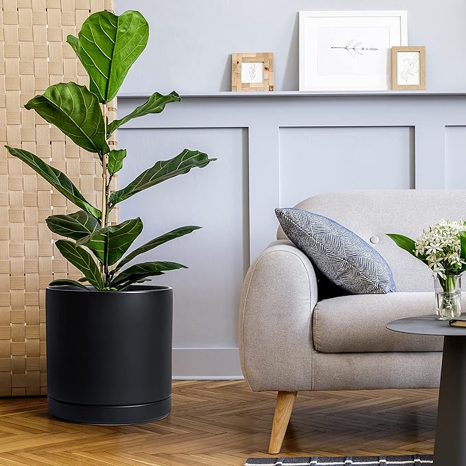 D'vine Dev 12 Inch Ceramic Planter Pot with Drainage Hole and Saucer, Indoor Cylinder Round Planter Pot, Black, 94-O-F-2