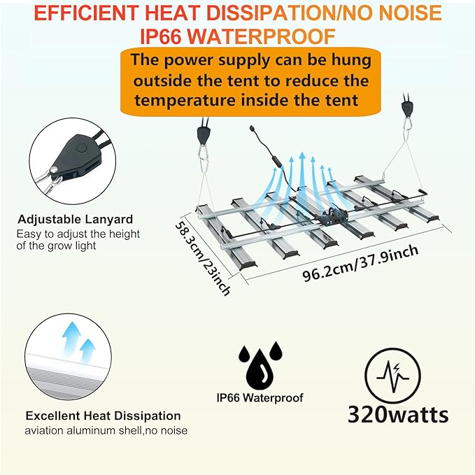 - 【Efficient Heat Dissipation and No Noise】Our grow lights are made of 4 lightweight aluminum bars, which has efficient heat dissipation and cooling functions.it's powerful heat dissipation ability that no need to buy more cooling devices.This led plant light has no fan, there will be no noise.it is very light weight and IP67 waterproof,so it's easy to carry and install.