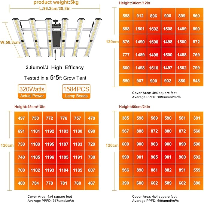 - 【Max Coverage Area Plant Lamp Full Spectrum】320W Full spectrum (380-410 nm, 660-665nm, 730nm,3200-4200K,4800-5000K) is perfect for veg to grow,6 LED grow lights bars , it can provide evenly distributed light intensity.It can coverage for 4x4ft of high-yielding full-cycle growth.