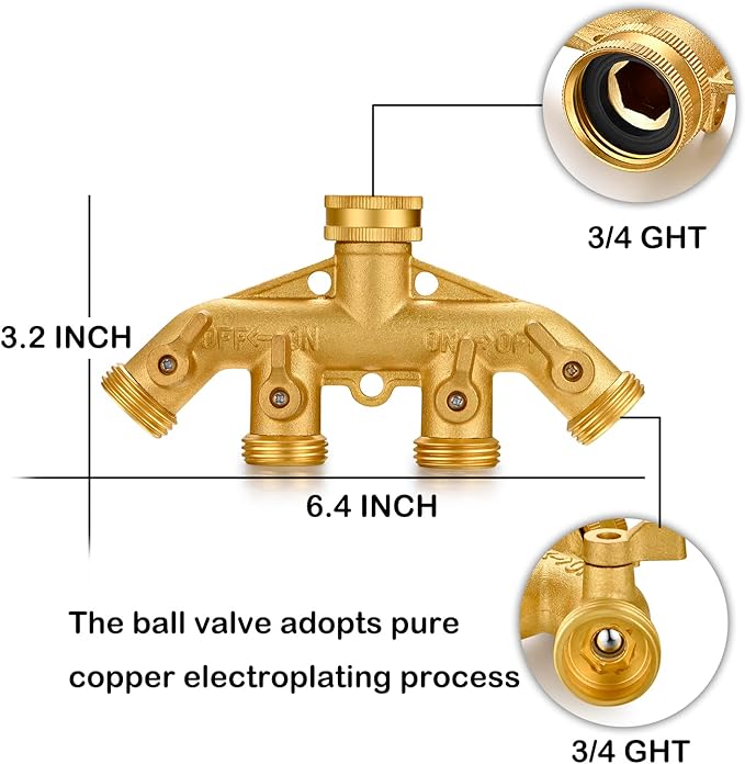 Garden Hose Splitter Heavy Duty Brass Connector, Garden Faucet Splitter for Outdoor Faucet Hose Bib Splitter, Adapter with Comfortable Grip Shut Off Valves (4 Way splitter)