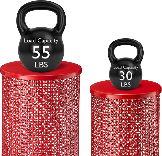 - Sturdy: The set of 2 decorative garden stools are made of high quality metal, sturdy and rustproof for long-time use. Size: L: 14.5"D×19.25"H, S: 12.5"D×16.5"H. The weight capacity of the large stool is 55 lb, and the weight capacity of the small one is 33 lb.