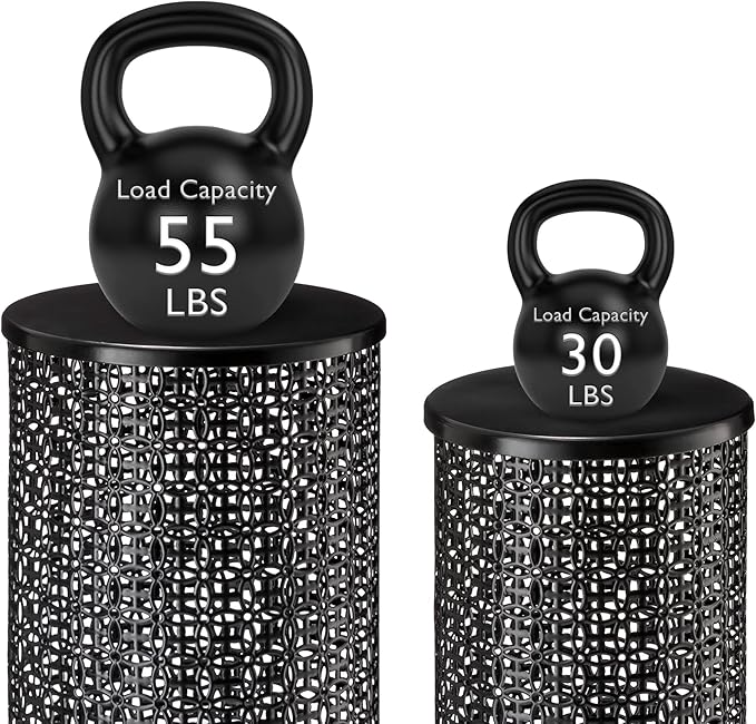 - Sturdy : The set of 2 decorative garden stools are made of high quality metal, sturdy and rustproof for long-time use. Size: L: 14.5"D×19.25"H, S: 12.5"D×16.5"H. The weight capacity of the large stool is 55 lb, and the weight capacity of the small one is 33 lb.