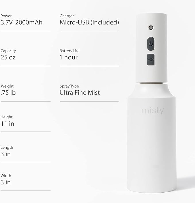 - Long Lasting Charge - mist-e is fully rechargeable and built to last. This wireless rechargeable plant spray bottle also doubles as an electric garden sprayer. It can simply be plugged into the included micro-USB charger, and the long-lasting lithium-ion battery is powerful enough to last for one hour of continuous spraying.