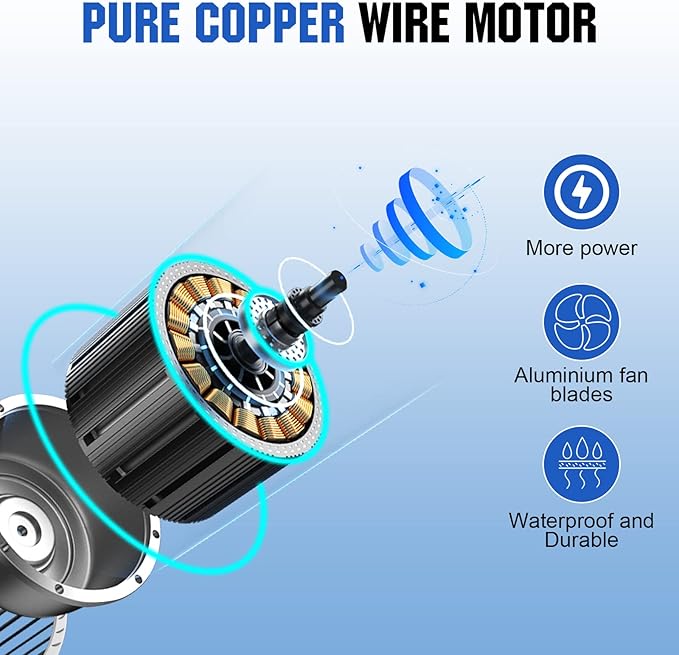 - 【RELIABLE AND DURABLE】-- The brushless motor is fully copper and IP68 waterproof. 9" aluminium fan blades are ultra-quiet, with a normal operating decibel of only 43db. The high strength metal housing is hail and weather resistant.