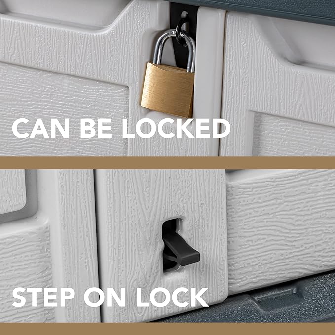 - Double Lock Design: Lock hole is reserved at the top of the cabinet, the pin at the bottom can be used for the foot switch without squatting. Two locks ensure that your goods are safe and complete outdoors. The flip supported by lever makes it convenient for you to store items quickly and easily