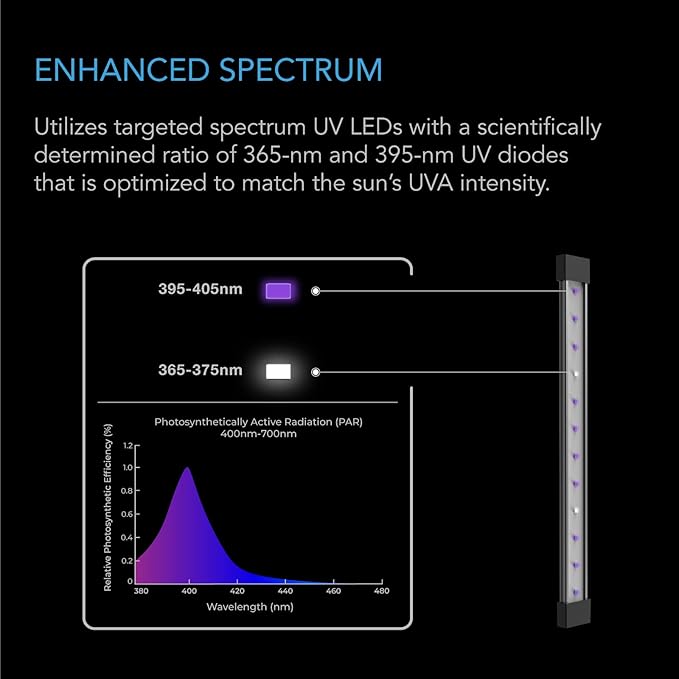 - Enhances fruit and flowering stages by utilizing a targeted UVA spectrum of 365nm and 395nm.